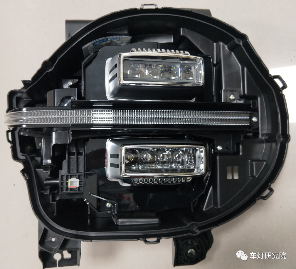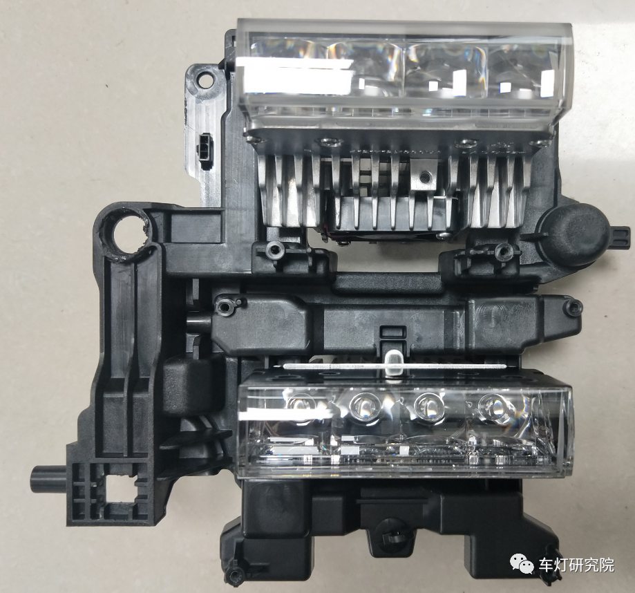 咱们继续拆解远近光模块。可以看到,远光和近光透镜的装饰框都是局部镀铝设计,可谓细节拉满,并且上下各设计了一个锯齿状的装饰,增添科技感的同时,也更贴合硬派越野的设计语言。而且近光透镜除了散热块外,还配有风扇散热,保证光性能,也要保证可靠性。远近光透镜都是方形的薄透镜,Z向开口约为20mm(20mm应当是当前量产车型中最小的尺寸了吧),可以说这款薄透镜也是刚好符合坦克这款车的整体设计语言。