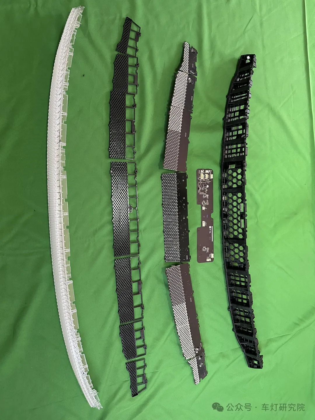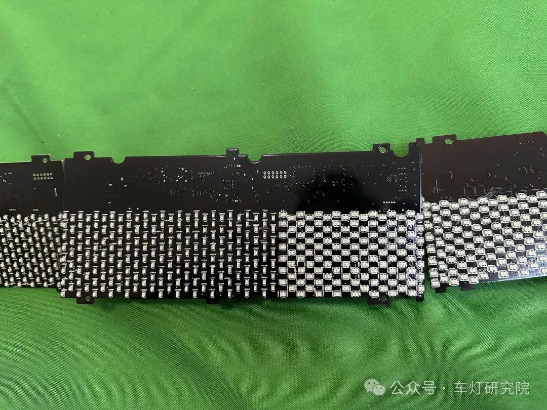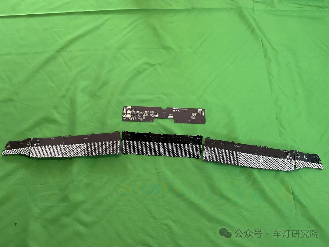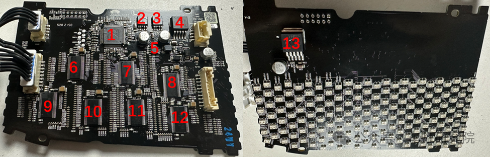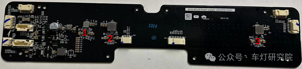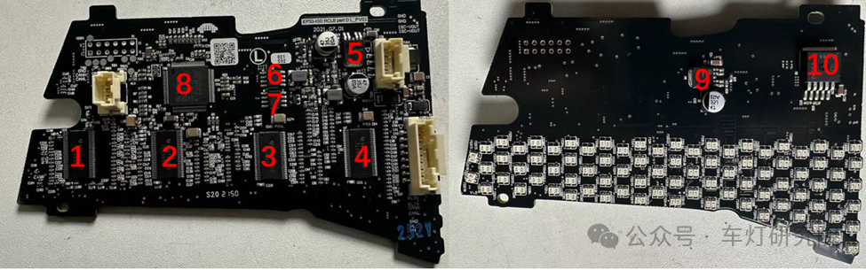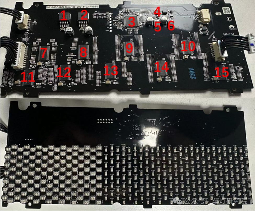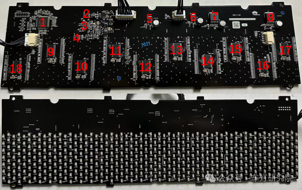 该电源板用于给灯板上的LED驱动芯片提供电源,总输出电流高达15A,考虑到灯板上大约一半是2颗LED灯一串,一半是一颗LED灯一串,DCDC输出电压一般为6V和3V左右,同时考虑到电源降额使用的情况,该电源板输出的峰值功率大概在40-50W左右。2号和8号灯板图片如下,在这两个灯板上,每块各有170颗LED灯,从LED灯排布上来看,每个LED驱动通道上,串/并联了两颗LED 灯。1-4. 德州仪器(TI) 非车规48通道LED Driver: TLC5955, 低边LED驱动,每通道最大输出电流31.9mA5,9.安森美(Onsemi)车规LDO:NCV4276C,45V输入耐压,2.5V或1.8V 输出,最大输出电流400mA . 用于给MCU供电。6,7:恩智浦(NXP)车规CAN收发器: TJA1042. 作为MCU与车机CAN 总线之间的信号中继。8: 英飞凌(Infineon)的车规MCU芯片: SAK-TC233LP-16F200F AC,32bit MCU. 用来控制灯板上的LED driver来实现不同的动画效果。10: 英飞凌(Infineon)的车规LDO:TLE42764GV, 45V输入耐压,5V 输出,最大输出电流400mA . 用于给MCU和LED driver逻辑部分供电。3号和7号灯板图片如下,在这两个灯板上,每块各有334颗LED灯,从LED灯排布上来看,每个LED驱动通道上,串/并联了两颗LED 灯。1:英飞凌(Infineon)的车规MCU芯片: SAK-TC233LP-16F200F AC,32bit MCU. 用来控制灯板上的LED driver来实现不同的动画效果。2,3:安森美(Onsemi)车规LDO:NCV4276C,45V输入耐压,2.5V或1.8V 输出,最大输出电流400mA . 用于给MCU供电。4,13:英飞凌(Infineon)的车规LDO:TLE42764GV, 45V输入耐压,5V 输出,最大输出电流400mA . 用于给MCU和LED driver逻辑部分供电5:恩智浦(NXP)车规CAN收发器: TJA1042. 作为MCU与车机CAN 总线之间的信号中继。6-12:德州仪器(TI) 非车规48通道LED Driver: TLC5955, 低边LED驱动,每通道最大输出电流31.9mA.4号和6号灯板图片如下,在这两个灯板上,每块各有435颗LED灯,从LED灯排布上来看,有一半的LED为两颗一串/并,一半的LED灯为1颗一串。1, 2:英飞凌(Infineon)的车规LDO:TLE42764GV, 45V输入耐压,5V 输出,最大输出电流400mA . 用于给MCU和LED driver逻辑部分供电3:英飞凌(Infineon)的车规MCU芯片: SAK-TC233LP-16F200F AC,32bit MCU. 用来控制灯板上的LED driver来实现不同的动画效果。4:恩智浦(NXP)车规CAN收发器: TJA1042. 作为MCU与车机CAN 总线之间的信号中继。5,6:安森美(Onsemi)车规LDO:NCV4276C,45V输入耐压,2.5V或1.8V 输出,最大输出电流400mA . 用于给MCU供电。7-15:德州仪器(TI) 车规48通道LED Driver: TLC6C5748-Q1, 低边LED驱动,每通道最大输出电流31.9mA. 5号灯板图片如下,在这个灯板上,共有457颗LED灯,该灯板上LED灯均为1颗一串。1:英飞凌(Infineon)的车规MCU芯片: SAK-TC233LP-16F200F AC,32bit MCU. 用来控制灯板上的LED driver来实现不同的动画效果。2,4:恩智浦(NXP)车规CAN收发器: TJA1042. 作为MCU与车机CAN 总线之间的信号中继。3:德州仪器(TI)车规高边开关:TPS1H100BQ, 导通电阻100mΩ,限流点可调。5,6:安森美(Onsemi)车规LDO:NCV4276C,45V输入耐压,2.5V或1.8V 输出,最大输出电流400mA . 用于给MCU供电。7,8: 英飞凌(Infineon)的车规LDO:TLE42764GV, 45V输入耐压,5V 输出,最大输出电流400mA . 用于给MCU和LED driver逻辑部分供电9-18:德州仪器(TI) 非车规48通道LED Driver: TLC5955, 低边LED驱动,每通道最大输出电流31.9mA.上面是各个板子的解析,从电源架构上来说,并不复杂,主电源板由3颗MPS的降压芯片组成;各灯板的架构非常类似,MCU+48通道LED driver, 同时搭配英飞凌和安森美的LDO用作MCU和LED driver的辅助供电;控制信号方面,每块板都贴有恩智浦的CAN收发器来提高信号的跨板传输可靠性。要实现复杂的动画和动画的个性化,最困难的在于软件的编写,使各灯板能够协同工作。总体来说,智己L7的ISC后尾灯,用料十分扎实,都是成熟的半导体大厂物料,但对于LED Driver来说,却大量使用了非车规的TLC5955,仅有不到1/3的LED driver使用的是车规的TLC6C5748-Q1,在可靠性多少让人有点不放心. 单纯这个ISC后尾灯是使用了2335颗LED灯,7片车规级MCU, 50颗48通道LED driver 和10多颗LDO,造价上可以说非常昂贵了。