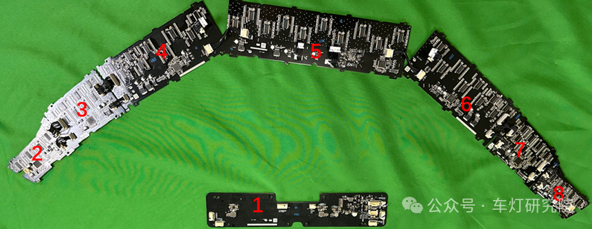 从大的模块来看,这款尾灯可以分为面罩,信号灯部分,交互屏部分和灯壳。我们重点来看看交互屏部分的拆解。整体来看,交互屏部分有白片聚光器,黑片的遮光器,光源pcba,控制pcba和支架。白片的聚光器有密密麻麻非常多的光学柱,这些和黑片遮光器上的孔还有pcba上的led灯珠是对应的。小编无聊还特地数了一下,在一共7块灯珠板上,分别有170(2颗一串)、334(2颗一串)、240(2颗一串)+195(单颗)、457(单颗)、240(2颗一串)+195(单颗)、334(2颗一串)、170(2颗一串)。共计2335颗。单从结构上来看并不复杂,由于造型的扁平化,整个屏就是由led直射并通过聚光器呈现出来,同时由遮光器做好防串光工作即可。光学方案不复杂,复杂的在于电子控制。毕竟是可以在等红绿灯的时候放一段魂斗罗的小视频。PCBA如下图,总共由8块PCBA组成。1号板为电源板,2-8号板为灯板,灯板和外观是对称的,所以2、3、4号板分别和8、7、6号板一样。1:芯源(MPS)的车规级36V/3A降压DCDC芯片:MPQ4483