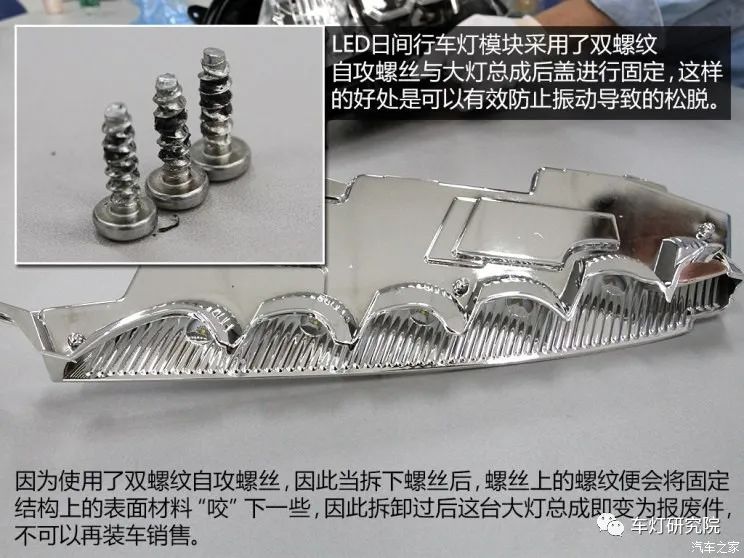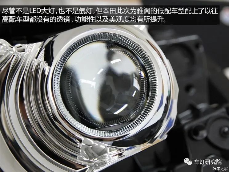 除了光源本身,雅阁LED大灯总成的其它部件也经过了斯坦雷的优化设计。例如,位于大灯总成最外面的、常年与外界环境接触的镜面面罩采用了外部硬化技术,厂家表示经过该技术处理后的镜面面罩不会轻易发黄,耐久性更好。另外,雅阁的LED大灯总成看起来有一种轻微的熏黑效果,这是因为灯内的辅杯部件经表面镀铝后采用了颜色略深的烟雾涂装,相比于雅阁卤素大灯总成的无漆塑料辅杯更加美观,成本也更高。