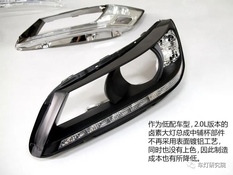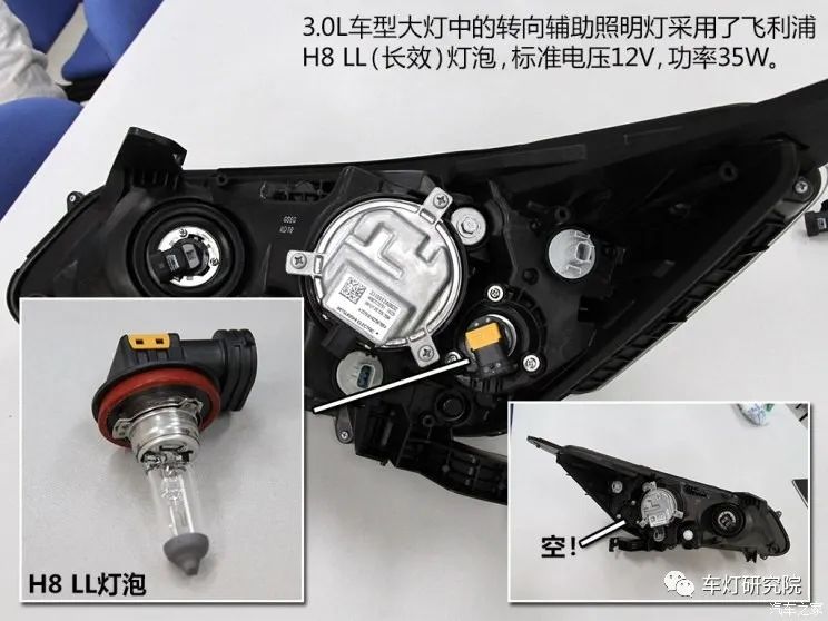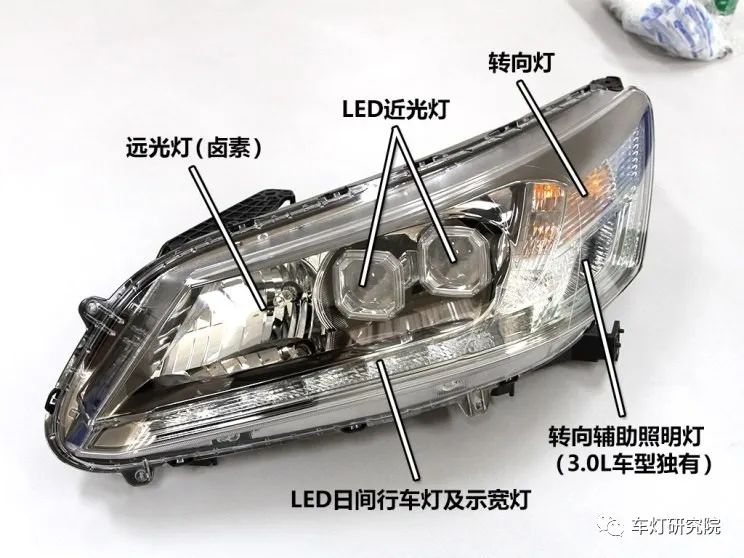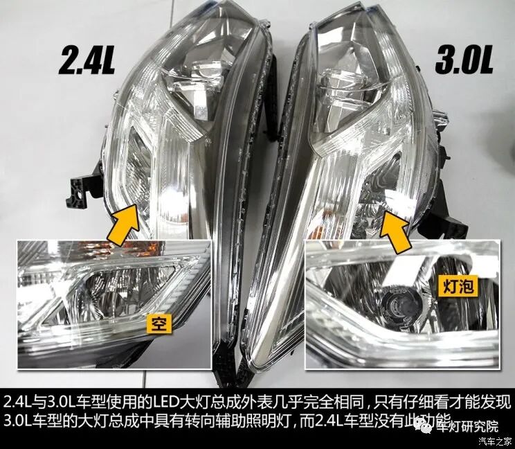 对于顶配3.0L车型上采用的大灯总成,与2.4L车型的区别主要有两点:1.配有转向辅助照明灯;2.由于3.0L车型具有独立的LED日间行车灯,原2.4L车型上LED日行灯及示宽灯模块仅作示宽灯用。其它部分两款总成则完全相同。