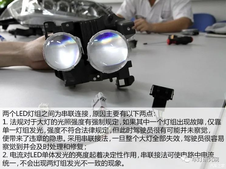 在这款LED大灯中,近光模块中的两个LED灯组为串联连接。学过中学物理的朋友都知道串联的弊端:当电路中某一部位出现故障导致断路时,整个电路中将没有电流。也就是说,只要一个LED灯组处发生断路故障,整个近光模块就将完全失效。既然如此,工程师为什么还要这样设计呢?