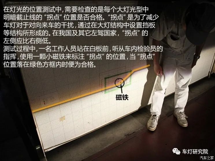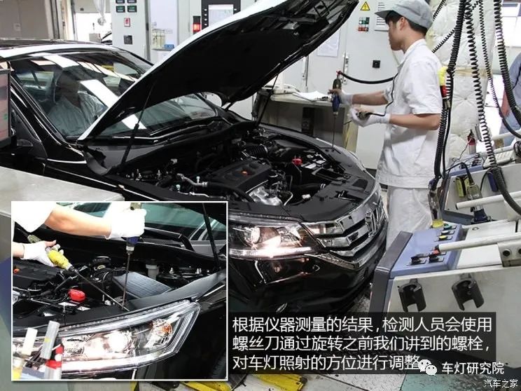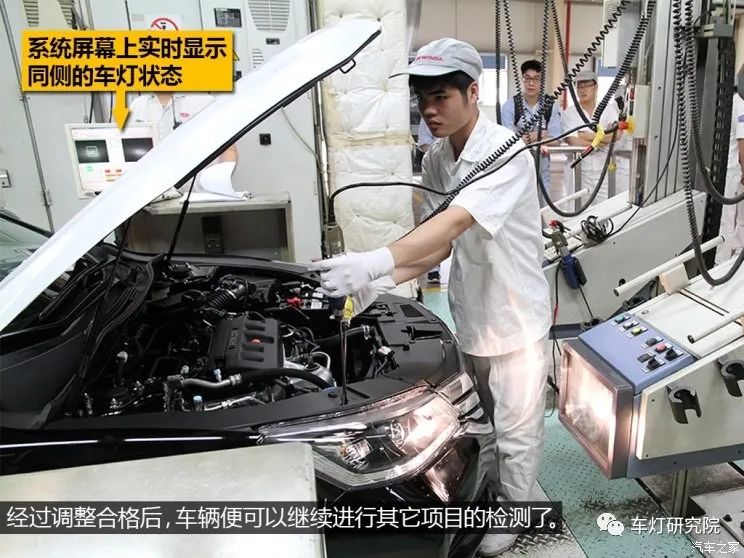 在整车生产过程中,车辆下线后将在总装车间的检测线上完成一系列系统的检测,其中就包括灯光系统。在灯光监测工位上,检测人员使用仪器测量大灯的亮度和高度,并针对照射高低和左右的偏差进行调整。