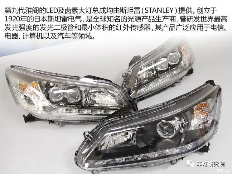 第九代雅阁的LED及卤素大灯总成均由斯坦雷(STANLEY)提供。创立于1920年的日本斯坦雷电气,是全球知名的光源产品生产商,曾研发了世界最高发光强度的发光二极管、最小体积的红外传感器,其产品广泛应用于电信、电器、计算机、汽车等领域,是丰田、本田、福特等整车厂家的供应商。目前已在广州、深圳、天津、苏州等地建立生产基地,广汽本田全系车型大灯总成均来自于位于广州市萝岗区的广州斯坦雷电气有限公司。