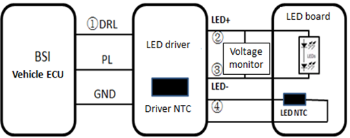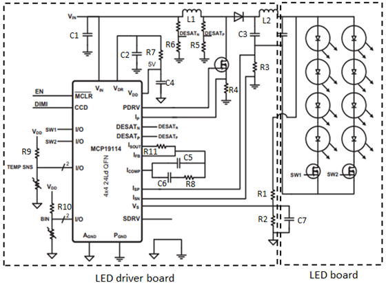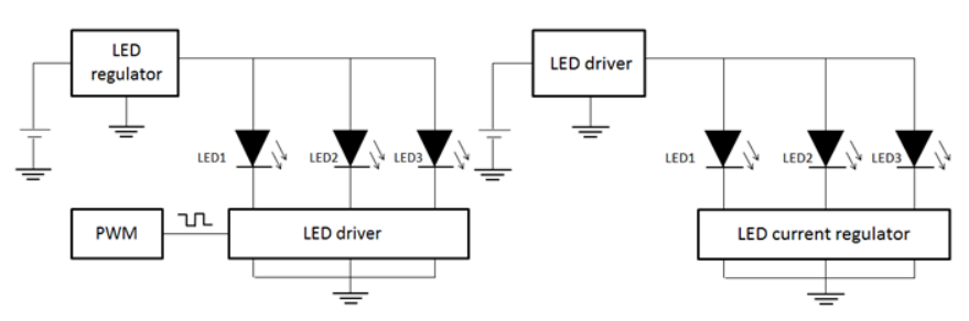 #简介# 随着LED技术在汽车车灯中的广泛应用,电子产品的比例越来越高。由于LED可以实现更多的功能,因此基于人类情感的图像自动化和高度智能等技术每天都在如雨后春笋般涌现。从概念的角度来看,与LED技术集成的汽车灯不仅考虑了LED的使用寿命及其可靠性,还考虑了LED驱动器的使用寿命及其可靠性。长时间照明后,诸如色散或均匀性恶化等缺陷总是会出现。为了消除这些缺陷,PWM技术被认为是这方面的最佳方法。本文介绍了基于PWM调光模式的白光LED驱动器设计,使读者对PWM技术有更好的了解。 01# LED驱动器 一般LED驱动器的P原则要求: 1)高效电源,电源需要是恒流LED驱动器,具有更高的精度,简单的i集成电路结构,更小的尺寸,更大的容量和更高的能量对流。 2)F或多功能结构,LED驱动器需要具有具有更好线性度的调光功能。 3)高效电源,电源需要是恒流LED驱动器,具有更高的精度,简单的i集成电路结构,更小的尺寸,更大的容量和更高的能量对流。 02# PWM调光原理 由于亮度和占空比之间的线性度极佳,如果我们输入恒定的占空比,可以保证LED颜色和亮度的稳定性,这是PWM调光技术的突出优势。 PWM 调光是通过方波通过调整正向接通时间的正向导通 LED 实现的。从理论上讲,如果我们使用LED调光技术,LED总是会出现闪烁现象,但是,由于人眼对闪烁现象的敏感性差,也就是说,如果闪烁频率高于100Hz,我们只能看到除闪烁现象以外的平均亮度。除此之外,对于频率高于100 Hz的闪烁现象,对亮度的感知总是累积效应,也就是说,在一个周期内,如果接通时间的比例更大,人眼会感知到LED的亮度越高。遵循这一原理,如果我们在一个周期内调整LED输入电流的持续时间,即占空比,就可以实现LED亮度的调整。 实现LED调光技术的具体方法是引入MOS晶体管或直接驱动LED,通过设置不同的占空比来改变亮度。 图1. 调光原理图解 表1. 调光的不同方式及优缺点 03# PWM驱动的典型白光LED电路 1)PWM直接驱动 如图2所示,PWM信号直接驱动LED D2。如果PWM信号直接来自微控制器端子,由于电流输入的容量相对较低(总是几十mA),电路只能驱动功率较小的LED,如位置灯或内部照明或环境灯。如果电路使用中等功率LED,则PWM的信号可以通过线性电路获得。在此背景下,由于PWM精度差,将出现不稳定的彩色图像和均匀性。 图2 PWM直接驱动LED 2)通过晶体管(或MOS)驱动 如图3所示,与直接连接LED的电路相比,通过引入MOS对LED亮度的调节范围会更宽。在电路中,MOS晶体管的位置始终位于LED的负极,正端始终与稳定的电源连接。这种方式始终在电路与多串联的情况下使用,以确保所有LED的一致性。本电路中,PWM信号可以来自外部环境(例如,通过改变环境亮度来调节汽车灯的亮度),或者引入开关电源或线性电源,以相对较高的精度保证颜色的稳定性和均匀性。 图3 MOS晶体管驱动 3)单片机调光 如图4所示,亮度调节直接通过DC-DC开关模式电源或微控制器实现。首先,microcontroller和LED之间有很多连接方式,通过仅使用一个输出通道来控制所有LED,或者通过使用每个通道来控制每个串联LED(对于具有许多串联LED的TOP结构)。LED调节器在整个电路中起到功率补偿的作用,保证LED驱动器和调节器之间的电压可以等于LED的工作电压。 图4 微控制器驱动 04# 白光LED驱动器实例 1)设计要求及主要组织 在这个项目中,需要实现三个功能(位置,DRL和方向指示器)。其中位置和DRL通过双功能和单光源实现,这是一种PWM调光技术,以确保亮度的稳定性和相关色温满足5500+/-100k的要求。 图5 DRL/位置示意图 2)LED Micro-控制器 为了满足上述要求,我们选择MCP19114/5作为微控制器,这是一款数字增强型功率模拟器控制器,具有电压加速,电压降低,加速度降低和SEPIC等多TOP模式,内部时钟可以达到8M Hz,PWM可以保证+/-1%的精度。 3)电路概念及原理 LED驱动器是整个电路的核心部分。本项目LED驱动器的主要功能包括:与车辆输出信号匹配、逻辑控制三大功能、PWM信号及输出、热管理、电子磁兼容管理等,避免微控制器过热,电路可实现LED在150°C环境温度下自动关断。 图6 LED驱动板和LED板原理图 05# 原型的M制造和测试 1)LED驱动器制作 在综合了LED驱动器的概念要求和设置参数后,我们研究了集成电路并制造了以下原型。PCB的布局由两层实现。在PCB布局后完成仿真。我们在 LED驱动板上增加了保护屏蔽,以增强抗干扰等级。如图7所示。 图7 发光二极管驱动器示例 2)基于PWM频率的调试 在正常连接下,测试DRL在工作时的工作频率,测试结果显示频率为300KHz,符合预设结果。 图8 PWM调试频率 3)不同温度和电压下的C测量 根据测试条件,在-40°c、23°c、85°c和9V、12V、14V和16V的电压条件下进行电流测试,表明所有LED电流的电流可以保持在300Ma,并且没有闪烁现象或异常关断,表明恒定输出可以满足规格。 4)电磁兼容测试结果 根据测试条件,在-40°c、23°c、85°c和9V、12V、14V和16V的电压条件下进行电流测试,表明所有LED电流的电流可以保持在300Ma,并且没有闪烁现象或异常关断,表明恒定输出可以满足规格。 #结论# 本项目设计了基于MCP19114/5的LED驱动电路,实现了DRL/位置/方向指示器的功能,并完成了样机。测试结果显示,LED驱动器可以正常工作。 文章转自 公众号 IFAL