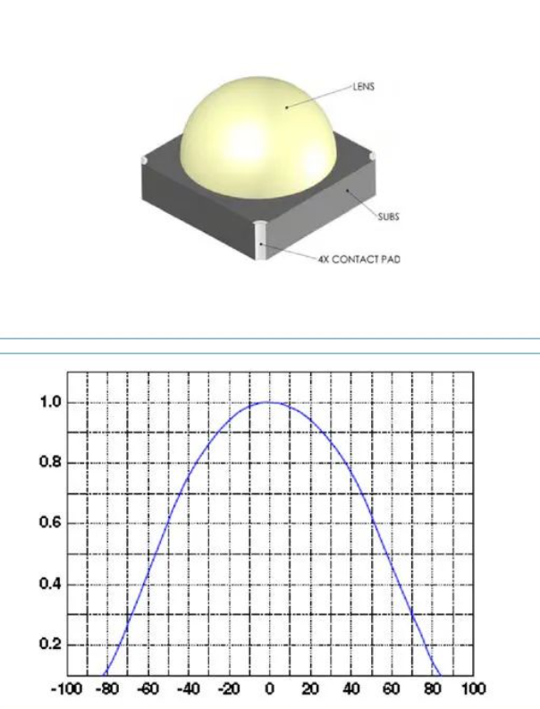 1.平面封装:出光效率较低,界面反射较严重,配光曲线持续平滑,发光角度一般稍大于120°。这种封装结构适用于需要宽角度照明的应用。
