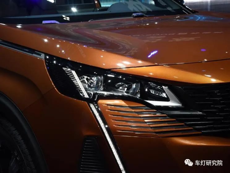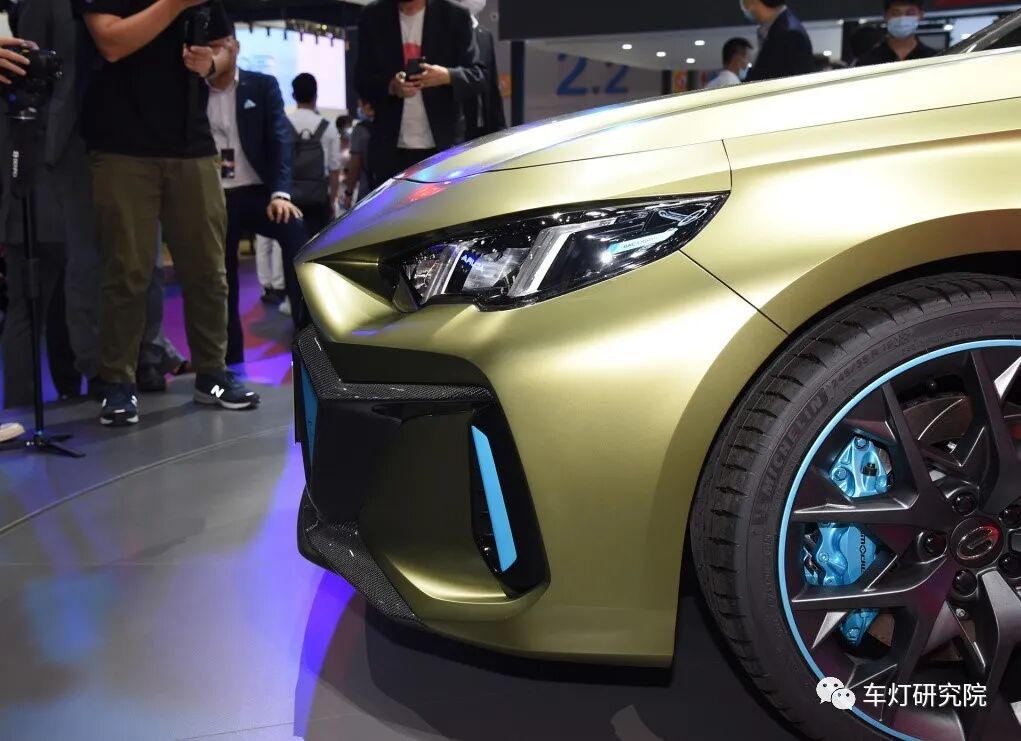 这是一款外形非常前卫运动的A+级轿车,从轮毂尺寸到车身与地面高度就可以看出,这款车主打年轻人市场,非常有赛车范儿。我们主要来看灯。前灯的设计从外轮廓来看主要是为了贴合车身的肌肉线条,设计师其实是用前突的前保勾勒车灯的锐利,使整个大灯更显深邃。有点12年款蒙迪欧上市时给人眼前一亮的感觉。灯内设计最显眼的就是两块前伸的厚壁日行灯了。远看很像两个爪子,正面看上去还有点像蛇的瞳孔。没有采用模组,而是搭配两个反光碗分别做远近光,小编个人认为是个不错的选择,降低成本的同时,也突出深邃的效果。从侧面看线条显得就非常锋利了,蓝色的装饰条也是和前保,还有轮毂的大卡钳做一个呼应。
