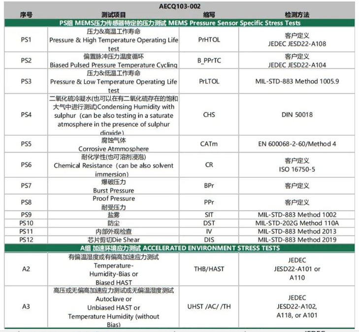 AEC-Q103:针对传感器件,为MEMS等传感器提供车规级测试标准。