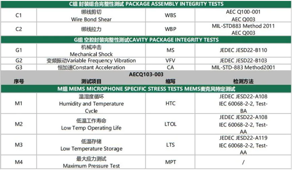 AEC-Q103是针对车载MEMS元件的测试标准,提供了更具针对性的测试要求,确保MEMS传感器在汽车中的可靠性。MEMS传感器在汽车中的应用越来越多样化,包括安全气囊、导航系统等,因此AEC-Q103标准的制定对于提高汽车安全性具有重要意义。