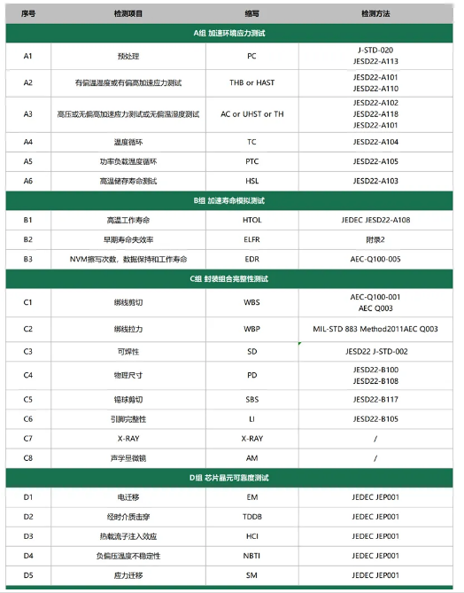 AEC-Q100标准是汽车级IC的综合可靠性测试认证标准,自1995年首次发布以来,经过多次更新,目前使用的是2014年的H版本。该标准规定了IC产品必须执行并通过的测试项目,包括环境压力测试、寿命模拟测试、封装组装整合测试、芯片晶圆可靠度测试、电气特性确认测试、瑕疵筛选监控测试等。
